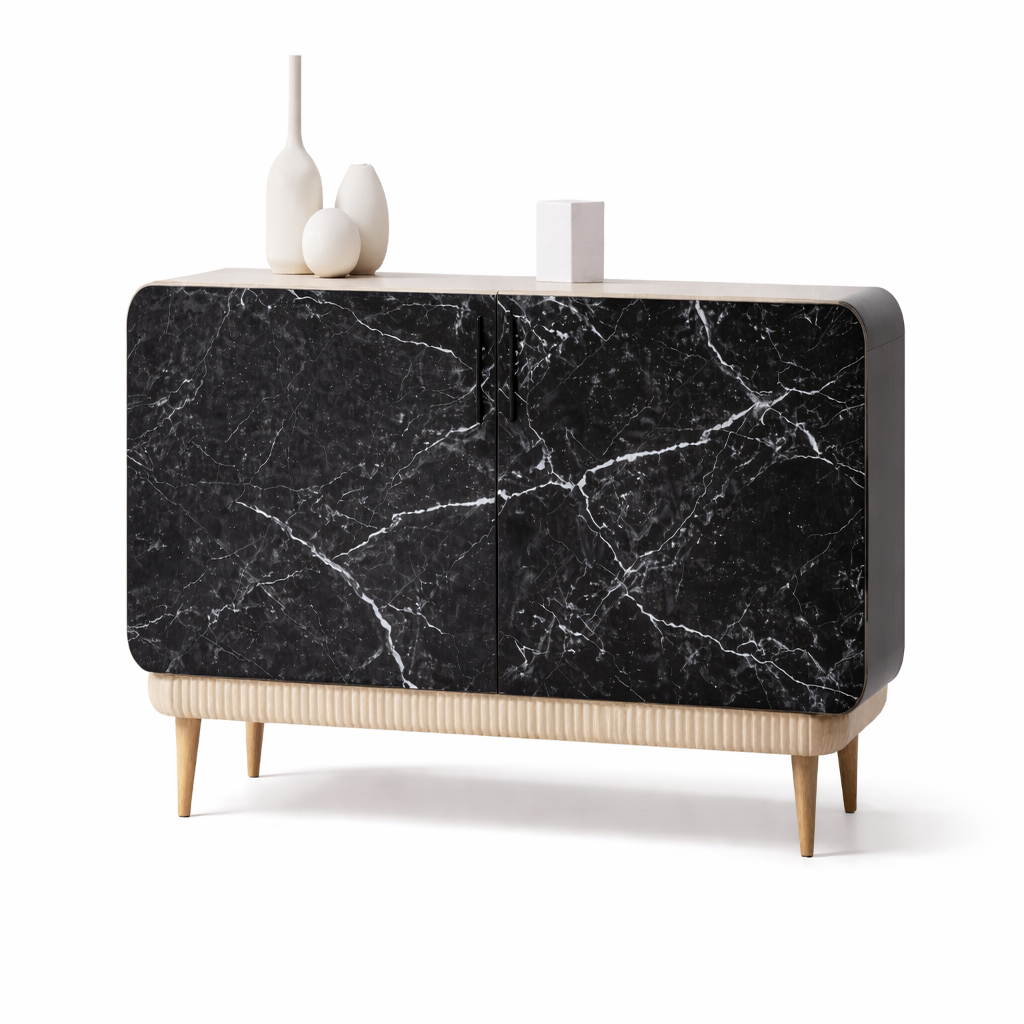 This modern storage cabinet features a black marble-pattern finish paired with wooden legs, creating a clean and balanced look suitable for contemporary interiors.
